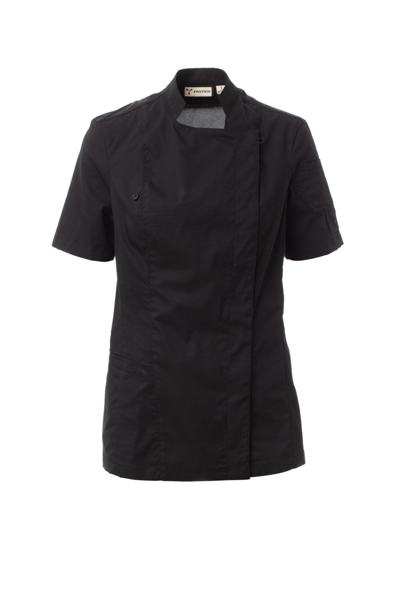 Kuharska jakna s korejskim ovratnikom, izrađena od nepoderivog pamučnog materijala i materijala Lycra® T400®, s izvrsnim elastičnim i prozračnim svojstvima i s udobnom mrežastom tkaninom na leđima kako bi se povećala prozračnost. Dvostruko kopčanje gumbima, preklopom i pričvršćivanjem na prsima pomoću vidljivog kopčanja gumbima, što stvara efekt krojačkog revera i inovativnog V-izreza. Kratki rukav s porubom. Zakrpa u obliku ikone na lijevom ramenu, s izvezenim spiralama u nijansi, opremljena džepom za olovke. Praktičan džep za pametni telefon u struku.